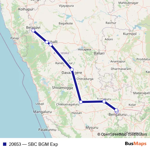The first stop of the 20653 rail route is KSR Bengaluru and the last stop is Belagavi. 20653 (SBC BGM Exp) is operational during everyday.