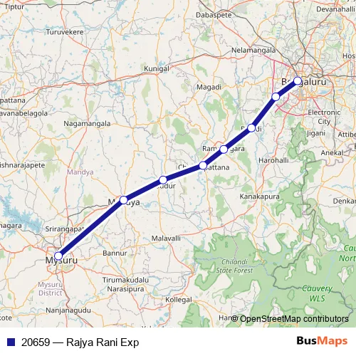 The first stop of the 20659 rail route is Mysore Jn and the last stop is KSR Bengaluru. 20659 (Rajya Rani Exp) is operational during everyday.
