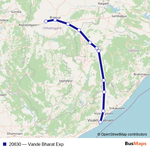 The first stop of the 20830 rail route is Visakhapatnam and the last stop is Durg. 20830 (Vande Bharat Exp) is operational during on weekends.