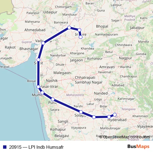 The first stop of the 20915 rail route is Lingampalli and the last stop is Indore Jn. 20915 (LPI Indb Humsafr) is operational during everyday.
