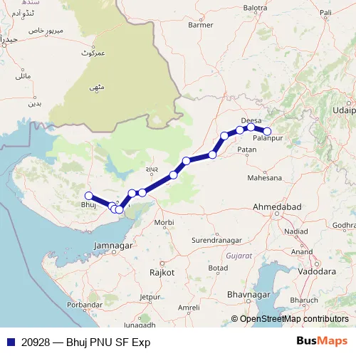 The first stop of the 20928 rail route is Bhuj and the last stop is Palanpur Jn. 20928 (Bhuj PNU SF Exp) is operational during everyday.