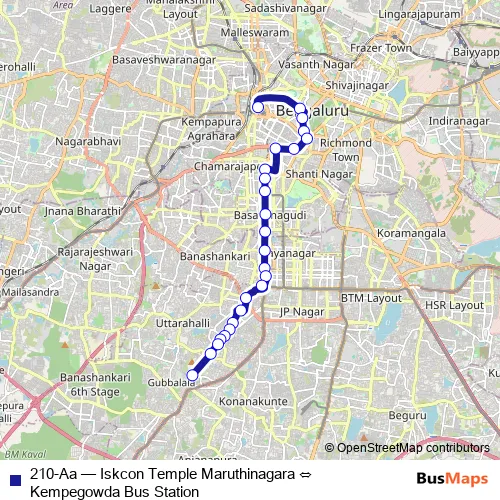 The first stop of the 210-Aa bus route is Kempegowda Bus Station and the last stop is Iskcon Temple Maruthinagara. 210-Aa (Iskcon Temple Maruthinagara ⇔ Kempegowda Bus Station) is operational during everyday.