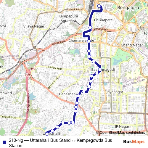 The first stop of the 210-Ng bus route is Uttarahalli Bus Stand and the last stop is Kempegowda Bus Station. 210-Ng (Uttarahalli Bus Stand ⇔ Kempegowda Bus Station) is operational during everyday.