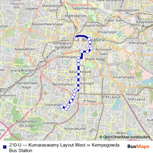 The first stop of the 210-U bus route is Kempegowda Bus Station and the last stop is Kumaraswamy Layout West. 210-U (Kumaraswamy Layout West ⇔ Kempegowda Bus Station) is operational during everyday.