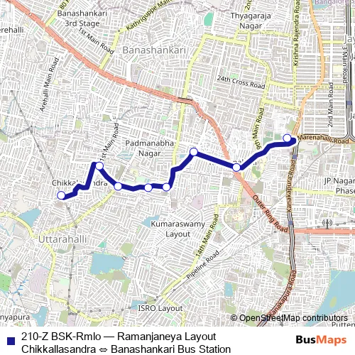 The first stop of the 210-Z BSK-Rmlo bus route is Ramanjaneya Layout Chikkallasandra and the last stop is Banashankari Bus Station. 210-Z BSK-Rmlo (Ramanjaneya Layout Chikkallasandra ⇔ Banashankari Bus Station) is operational during everyday.