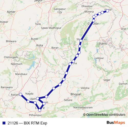 The first stop of the 21126 rail route is Bhind and the last stop is Ratlam Jn. 21126 (BIX RTM Exp) is operational during on weekends.