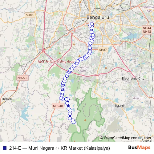 The first stop of the 214-E bus route is Muni Nagara and the last stop is KR Market (Kalasipalya). 214-E (Muni Nagara ⇔ KR Market (Kalasipalya)) is operational during everyday.