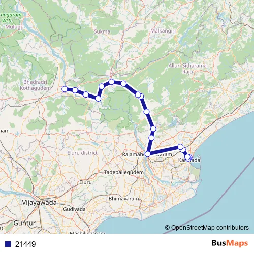 The first stop of the 21449 bus route is Kakinada and the last stop is