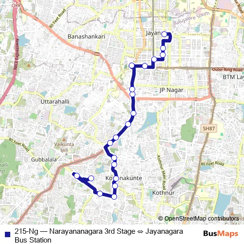 The first stop of the 215-Ng bus route is Narayananagara 3rd Stage and the last stop is Jayanagara Bus Station. 215-Ng (Narayananagara 3rd Stage ⇔ Jayanagara Bus Station) is operational during everyday.