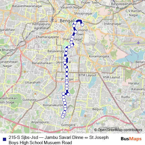 The first stop of the 215-S Sjbs-Jsd bus route is St Joseph Boys High School Musuem Road and the last stop is Jambu Savari Dinne. 215-S Sjbs-Jsd (Jambu Savari Dinne ⇔ St Joseph Boys High School Musuem Road) is operational during everyday.
