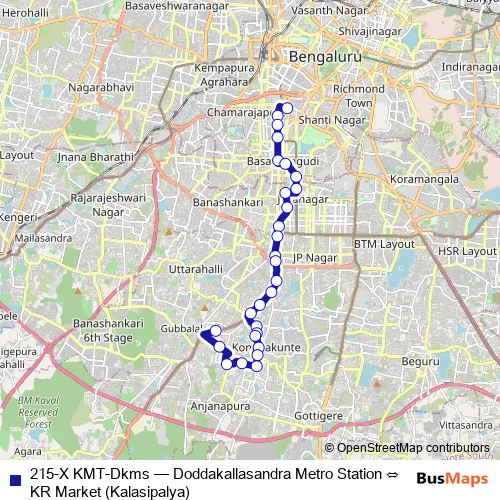 Click here to view the nearest 215-X KMT-Dkms - Doddakallasandra Metro Station ⇔ KR Market (Kalasipalya) bus stop.