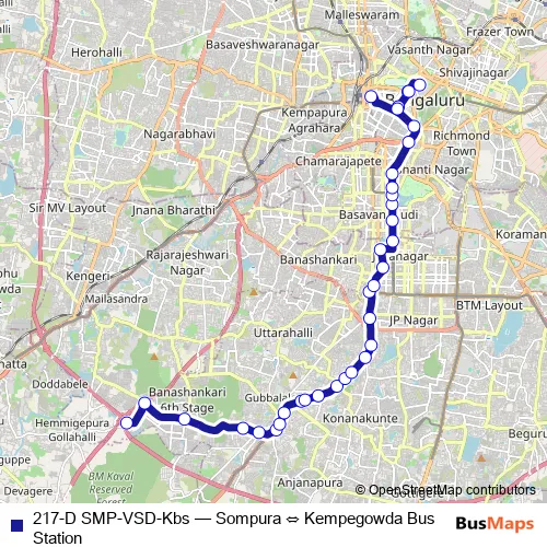 See why over 2 million users trust and consider busmaps.com as the best public transport website. busmaps gives you Bengaluru Buses suggested routes, real-time bus tracker, line route maps in Bengaluru, and helps to find the closest 217-D SMP-VSD-Kbs bus stops near you. No internet available? Download an offline PDF map and bus schedule for the 217-D SMP-VSD-Kbs bus to take on your trip.