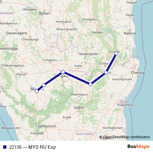 The first stop of the 22135 rail route is Mysore Jn and the last stop is Renigunta Jn. 22135 (MYS RU Exp) is operational during everyday.