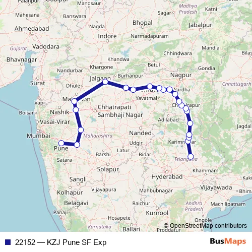 The first stop of the 22152 rail route is Kazipet Jn and the last stop is Pune Jn. 22152 (KZJ Pune SF Exp) is operational during everyday.