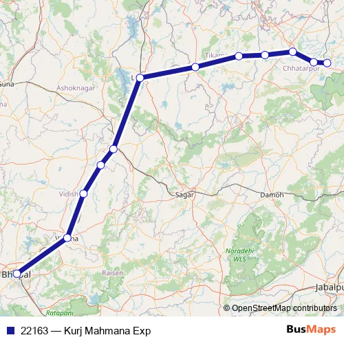 The first stop of the 22163 rail route is Bhopal Jn. and the last stop is Khajuraho. 22163 (Kurj Mahmana Exp) is operational during everyday.