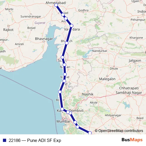 The first stop of the 22186 rail route is Pune Jn and the last stop is Ahmedabad Jn. 22186 (Pune ADI SF Exp) is operational during everyday.