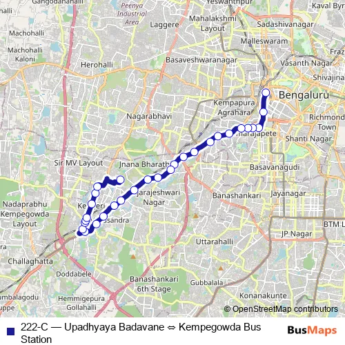The first stop of the 222-C bus route is Kempegowda Bus Station and the last stop is Upadhyaya Badavane. 222-C (Upadhyaya Badavane ⇔ Kempegowda Bus Station) is operational during everyday.