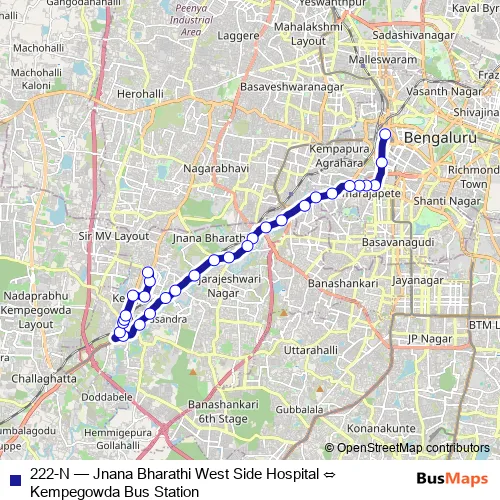 The first stop of the 222-N bus route is Kempegowda Bus Station and the last stop is Jnana Bharathi West Side Hospital. 222-N (Jnana Bharathi West Side Hospital ⇔ Kempegowda Bus Station) is operational during everyday.