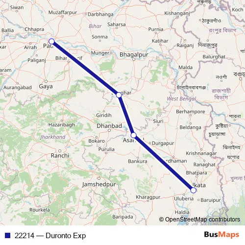 The first stop of the 22214 rail route is Patna Jn and the last stop is Shalimar. 22214 (Duronto Exp) is operational during everyday.