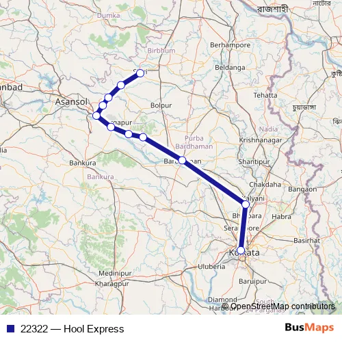 The first stop of the 22322 rail route is Siuri and the last stop is Howrah Jn. 22322 (Hool Express) is operational during everyday.