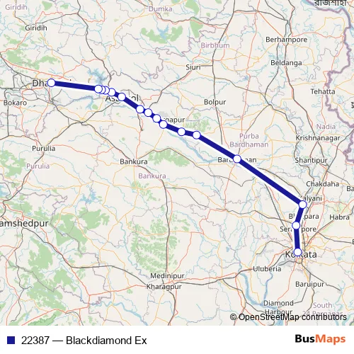 The first stop of the 22387 rail route is Howrah Jn and the last stop is Dhanbad Jn. 22387 (Blackdiamond Ex) is operational during everyday.
