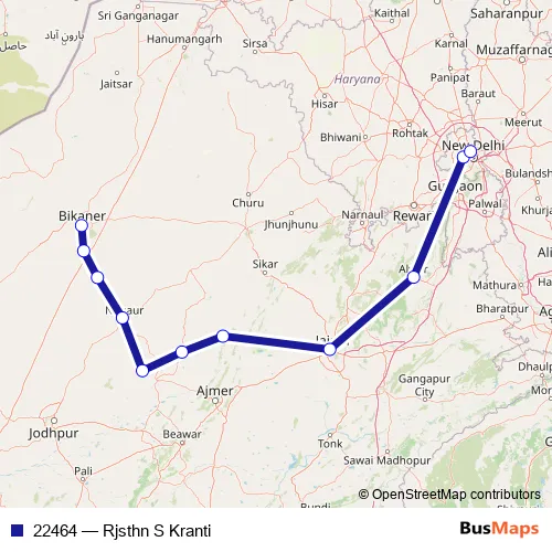 The first stop of the 22464 rail route is Bikaner Jn and the last stop is Delhi Sarai Rohilla. 22464 (Rjsthn S Kranti) is operational during everyday.