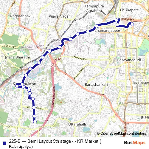 The first stop of the 225-B bus route is Beml Layout 5th stage and the last stop is KR Market (Kalasipalya). 225-B (Beml Layout 5th stage ⇔ KR Market (Kalasipalya)) is operational during everyday.