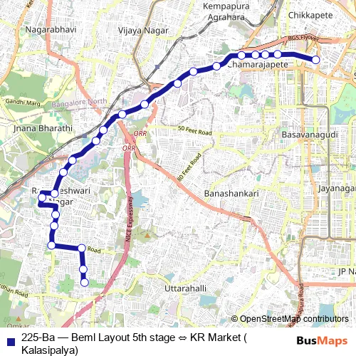 The first stop of the 225-Ba bus route is KR Market (Kalasipalya) and the last stop is Beml Layout 5th stage. 225-Ba (Beml Layout 5th stage ⇔ KR Market (Kalasipalya)) is operational during everyday.