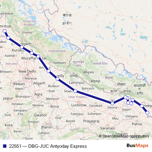 The first stop of the 22551 rail route is Darbhanga Jn and the last stop is Jalandhar City. 22551 (DBG-JUC Antyoday Express) is operational during everyday.