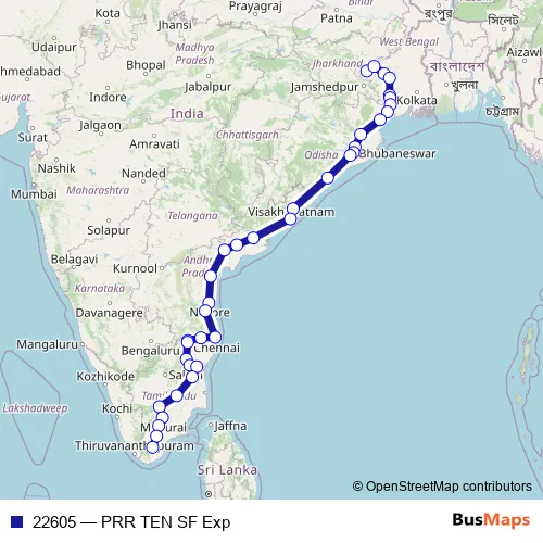 The first stop of the 22605 rail route is Purulia Jn. and the last stop is Tirunelveli Jn. 22605 (PRR TEN SF Exp) is operational during everyday.