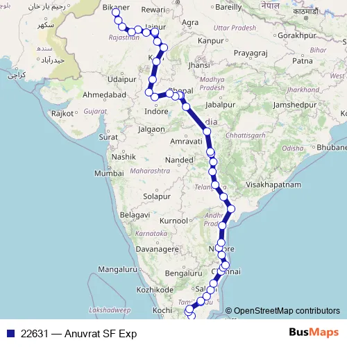 The first stop of the 22631 rail route is Madurai Jn and the last stop is Bikaner Jn. 22631 (Anuvrat SF Exp) is operational during everyday.