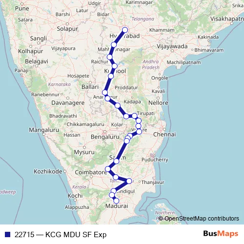 The first stop of the 22715 rail route is Kacheguda and the last stop is Madurai Jn. 22715 (KCG MDU SF Exp) is operational during everyday.