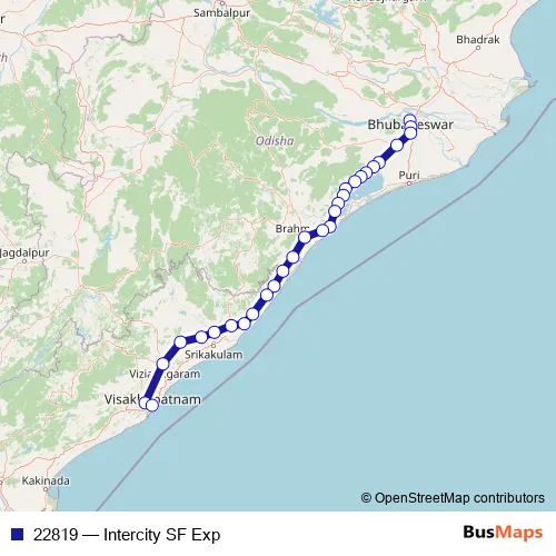 The first stop of the 22819 rail route is Bhubaneswar NEW Jn and the last stop is Visakhapatnam. 22819 (Intercity SF Exp) is operational during everyday.