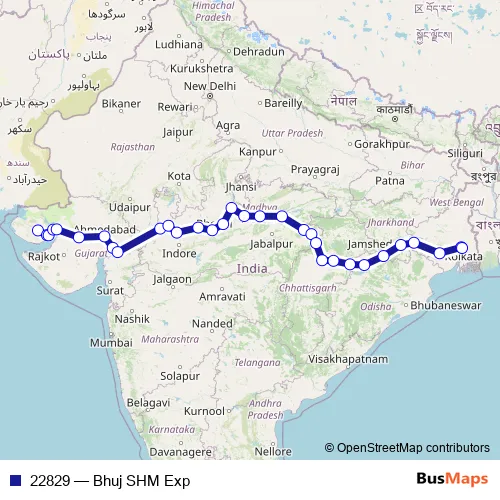 The first stop of the 22829 rail route is Bhuj and the last stop is Shalimar. 22829 (Bhuj SHM Exp) is operational during everyday.
