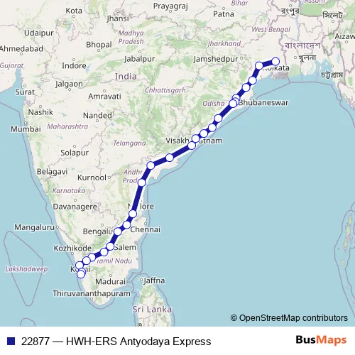The first stop of the 22877 rail route is Howrah Jn and the last stop is Ernakulam Jn. 22877 (HWH-ERS Antyodaya Express) is operational during everyday.