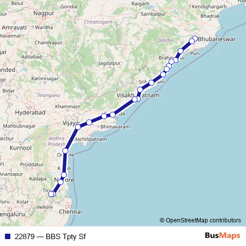 The first stop of the 22879 rail route is Bhubaneswar and the last stop is Tirupati. 22879 (BBS Tpty Sf) is operational during everyday.