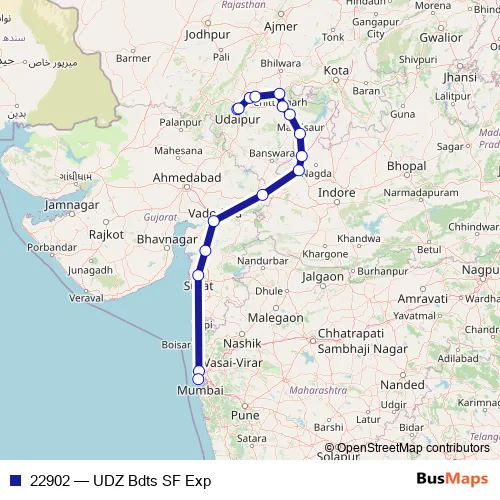 The first stop of the 22902 rail route is Udaipur City and the last stop is Bandra Terminus. 22902 (UDZ Bdts SF Exp) is operational during everyday.