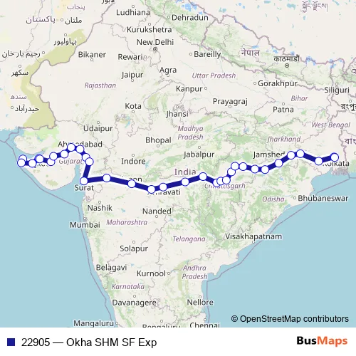 The first stop of the 22905 rail route is Okha and the last stop is Shalimar. 22905 (Okha SHM SF Exp) is operational during everyday.