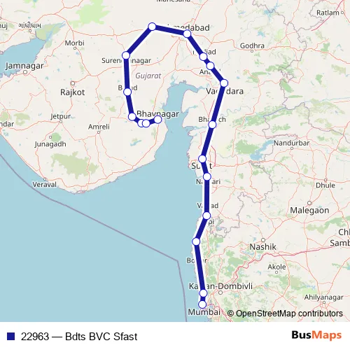 The first stop of the 22963 rail route is Bandra Terminus and the last stop is Bhavnagar Terminus. 22963 (Bdts BVC Sfast) is operational during everyday.