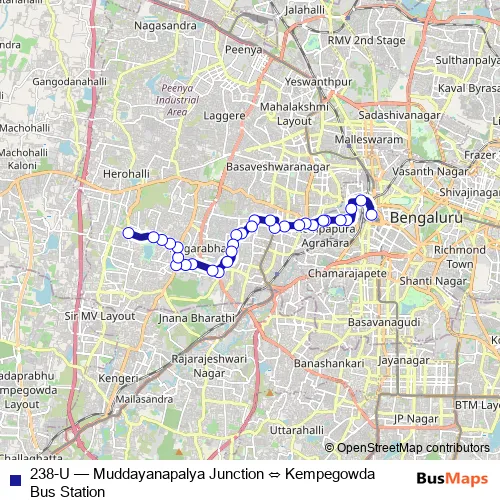 The first stop of the 238-U bus route is Kempegowda Bus Station and the last stop is Muddayyanapalya Junction. 238-U (Muddayanapalya Junction ⇔ Kempegowda Bus Station) is operational during everyday.