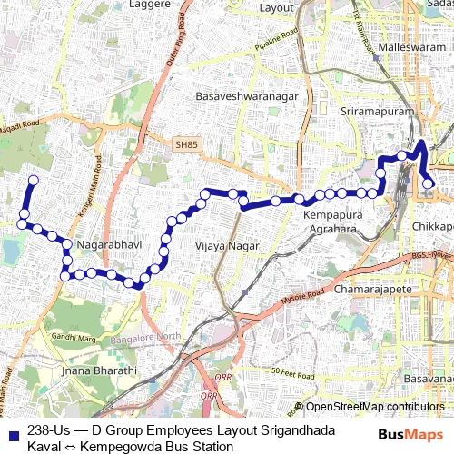 The first stop of the 238-Us bus route is D Group Employees Layout Srigandhada Kaval and the last stop is Kempegowda Bus Station. 238-Us (D Group Employees Layout Srigandhada Kaval ⇔ Kempegowda Bus Station) is operational during everyday.