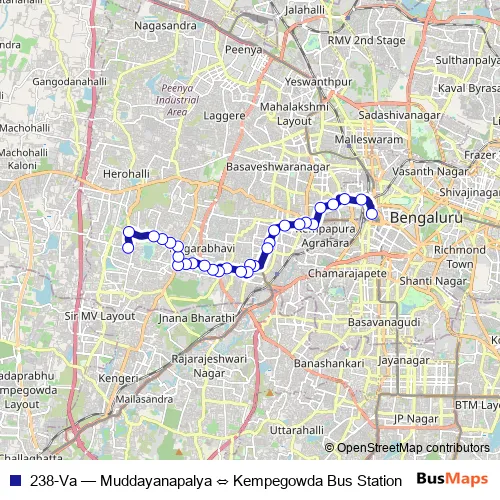 The first stop of the 238-Va bus route is Kempegowda Bus Station and the last stop is Muddayyanapalya. 238-Va (Muddayanapalya ⇔ Kempegowda Bus Station) is operational during everyday.