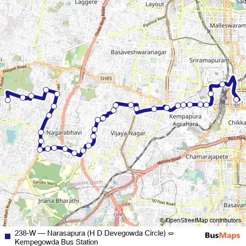 The first stop of the 238-W bus route is Narasapura (H D Devegowda Circle) and the last stop is Kempegowda Bus Station. 238-W (Narasapura (H D Devegowda Circle) ⇔ Kempegowda Bus Station) is operational during everyday.