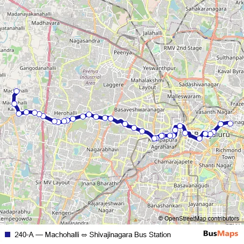 The first stop of the 240-A bus route is Shivajinagara Bus Station and the last stop is Machohalli. 240-A (Machohalli ⇔ Shivajinagara Bus Station) is operational during everyday.