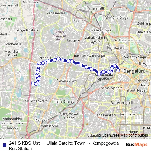 The first stop of the 241-S KBS-Ust bus route is Kempegowda Bus Station and the last stop is Ullala Satelite Town. 241-S KBS-Ust (Ullala Satelite Town ⇔ Kempegowda Bus Station) is operational during everyday.