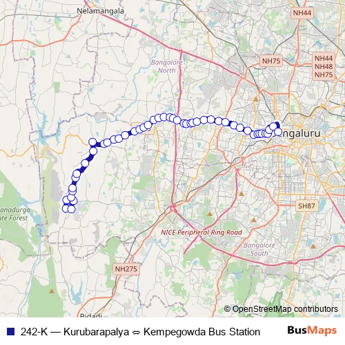 See why over 2 million users trust and consider busmaps.com as the best public transport website. busmaps gives you Bengaluru Buses suggested routes, real-time bus tracker, line route maps in Bengaluru, and helps to find the closest 242-K bus stops near you. No internet available? Download an offline PDF map and bus schedule for the 242-K bus to take on your trip.