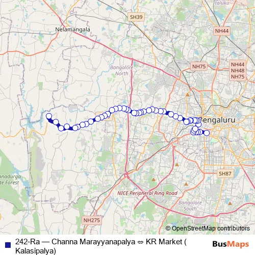The first stop of the 242-Ra bus route is KR Market (Kalasipalya) and the last stop is Channa Marayyanapalya. 242-Ra (Channa Marayyanapalya ⇔ KR Market (Kalasipalya)) is operational during everyday.