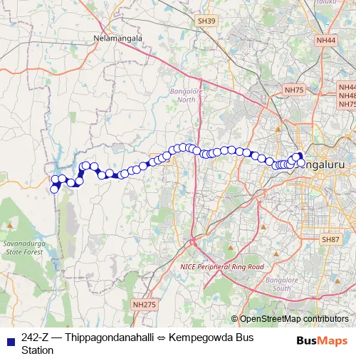 The first stop of the 242-Z bus route is Thippagondanahalli and the last stop is Kempegowda Bus Station. 242-Z (Thippagondanahalli ⇔ Kempegowda Bus Station) is operational during everyday.