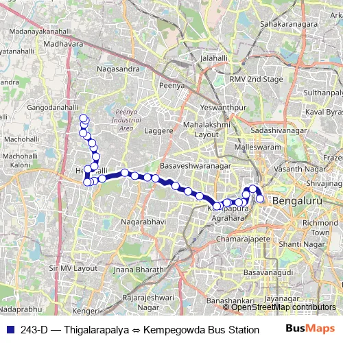 The first stop of the 243-D bus route is Kempegowda Bus Station and the last stop is Thigalarapalya. 243-D (Thigalarapalya ⇔ Kempegowda Bus Station) is operational during everyday.