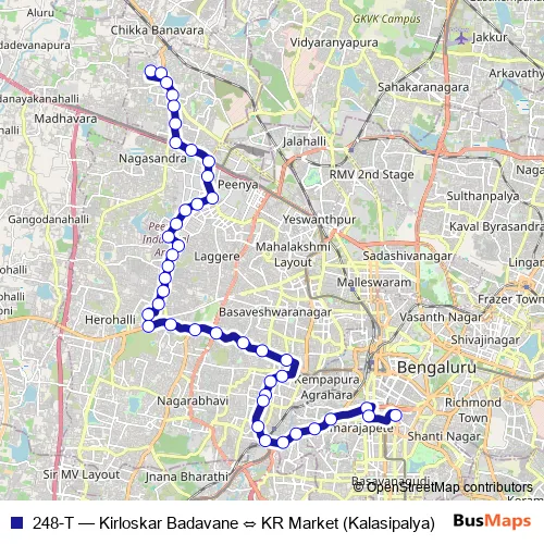 The first stop of the 248-T bus route is Kirloskar Badavane and the last stop is KR Market (Kalasipalya). 248-T (Kirloskar Badavane ⇔ KR Market (Kalasipalya)) is operational during everyday.
